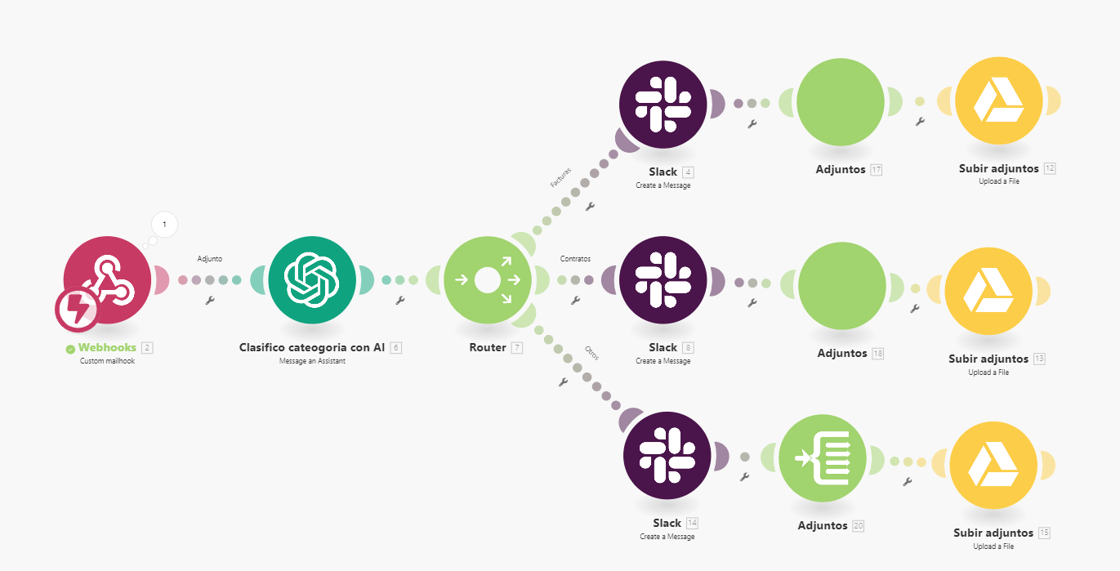 Una vez que mi asistente elegido la ruta adecuada, pediremos a Slack que nos notifique mediante un mensaje en el canal apropiado del nuevo adjunto recibido.