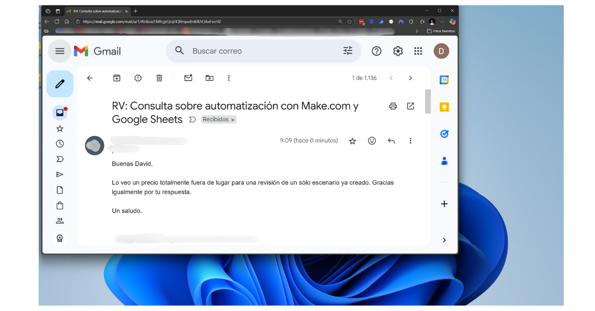 Con mi imagen y marca, es evidente que yo no conseguí hacer ver a este potencial cliente la importancia de tener su automatización funcionando sin errores y justificar el precio que le pedía (nota interna para mis deberes → aumentar mi percepción de valor)